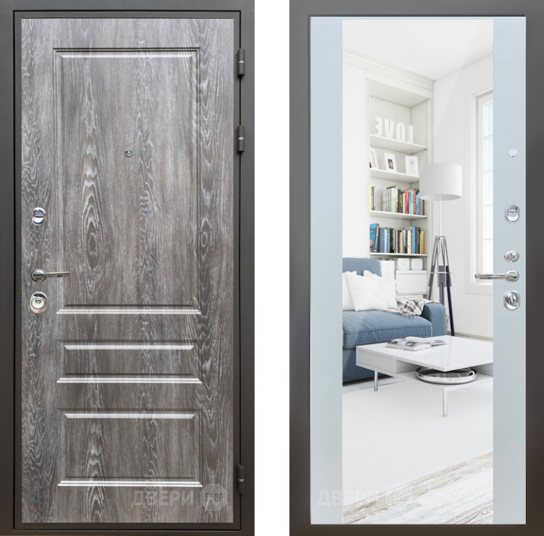 Входная Дверь Шелтер (SHELTER) Комфорт Дуб шале серебро 13 с зеркалом Белый матовый 860x2050 мм